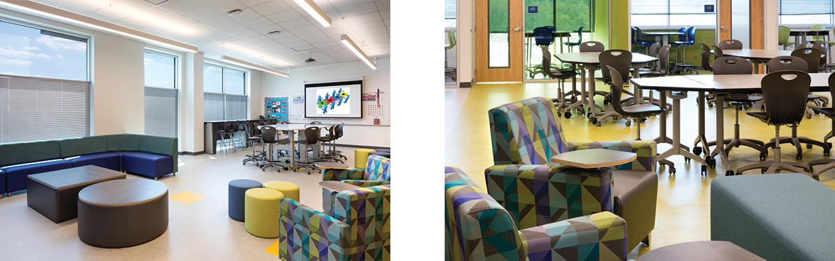 一堵可移动的墙将科学室和创客空间分隔开来。ZUMA系列实验室凳子配有定制的科学桌,中间分开,供较小的工作小组使用。桌下增加了储藏空间,用来存放工具、设备和学生物品。