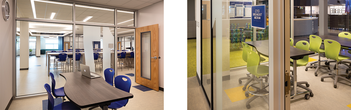 Virco的PlanSCAPE团队用一套移动家具来应对这些挑战。带脚轮的储物台和干擦板可以让教师轻松地创建明确的学习区域,而带软垫的座位单元和配有充电和发电站的立式高台则为小组会议和自主学习提供了指定的重点区域。该团队还提供了一系列玻璃围合的休息室,里面的课桌可以很容易地放在一起上课,也可以在考试时分开。为了取代教师的办公桌,专门为教师创建了专门的区域来工作和存储他们的文件和其他物品。