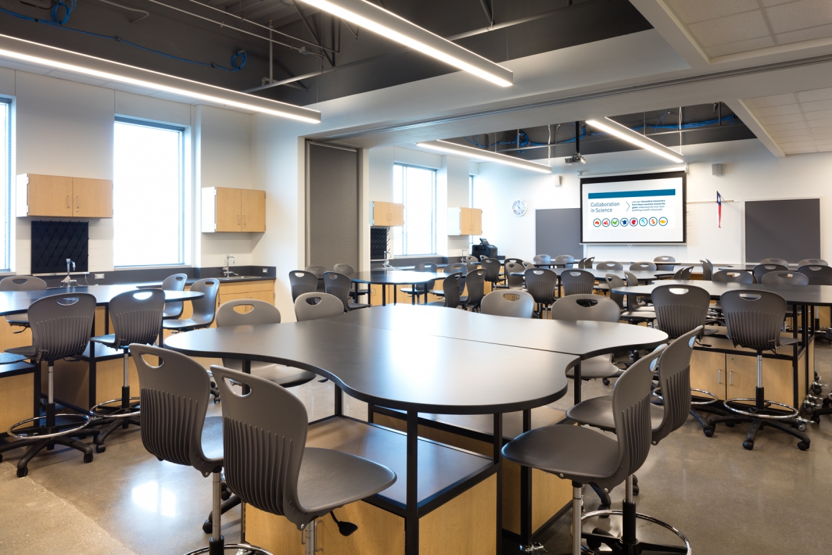 位于得克萨斯州马诺市的马诺新技术中学正在为其六年级、七年级和八年级的学生们准备迎接明天的世界。以STEM为重点,该校园旨在为900名学生提供开放概念环境下的技术集成课程。教师的角色主要是协助者,而不是讲师,学生们不是坐在传统教室前面指定的一排排座位上,而是面对面地学习,学习空间是为协作式、基于项目的学习而设计的。