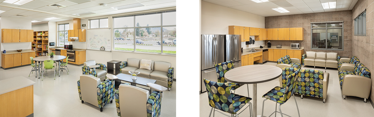 教职员休息室包括一个教师见面和合作的空间,有一系列的座位选择,包括咖啡桌和软座位。