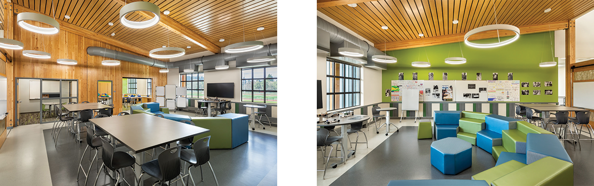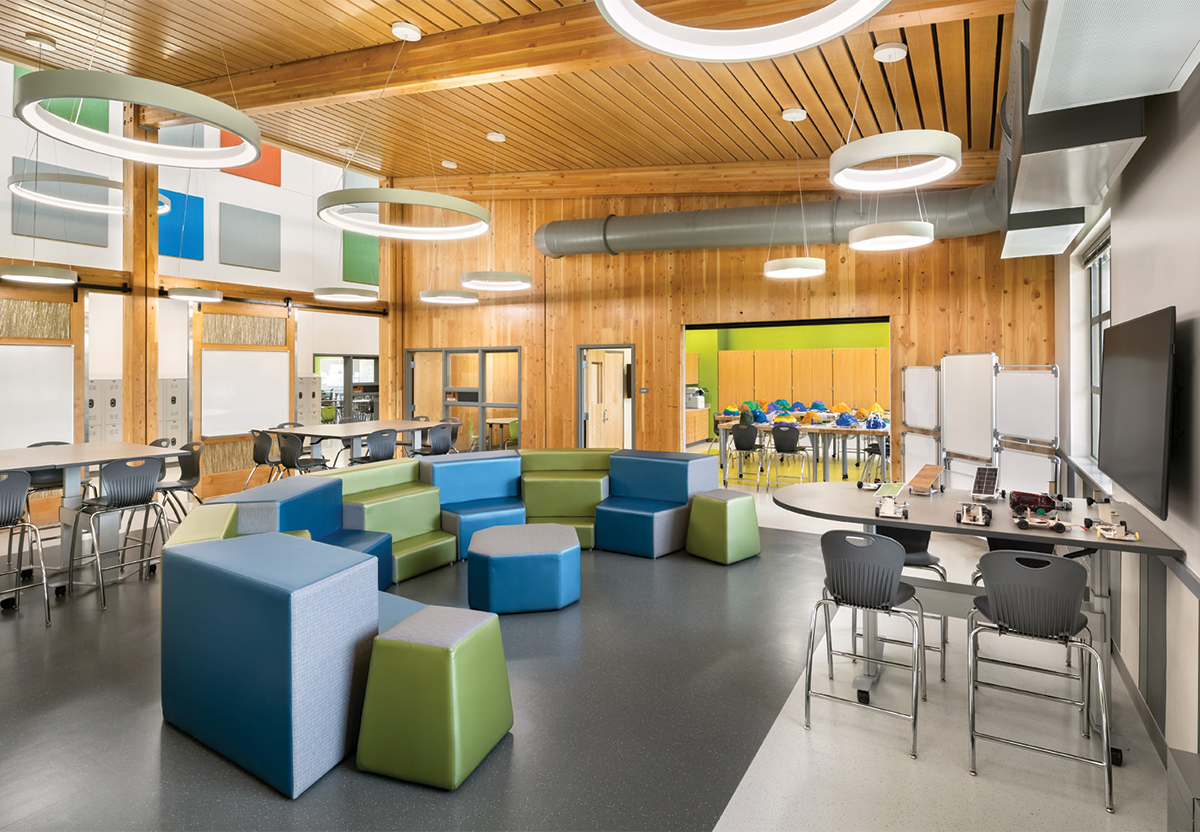 学习工作室,或教室,以分层的教室设置为特色,配备了三种不同高度的桌子和桌子,从站立高度到30英寸的固定高度不等。科学实验室包括活动桌,带有定制的木板顶面和软座。